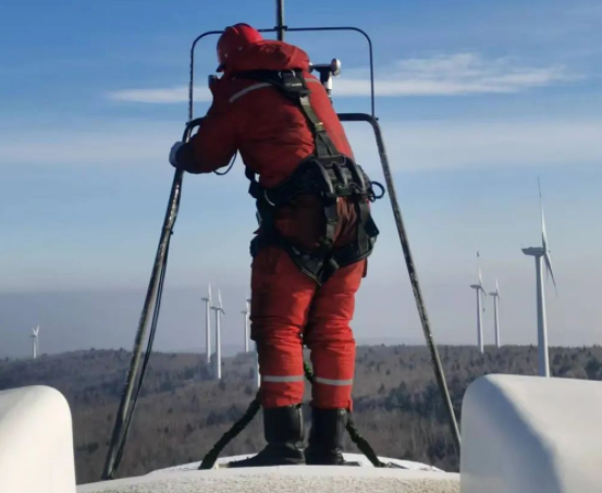 負(fù)責(zé)檢修的工作人員戴好安全帽、穿好安全衣、安全帶,佩戴好速差防墜器后,把防墜落安全鎖扣安裝在了爬梯上。在助爬器助力下,他們登上了75米高的風(fēng)機(jī),整個(gè)攀爬過程異常艱險(xiǎn),爬梯被冰雪覆蓋,非常光滑,稍有不慎就有可能從高空中墜落。